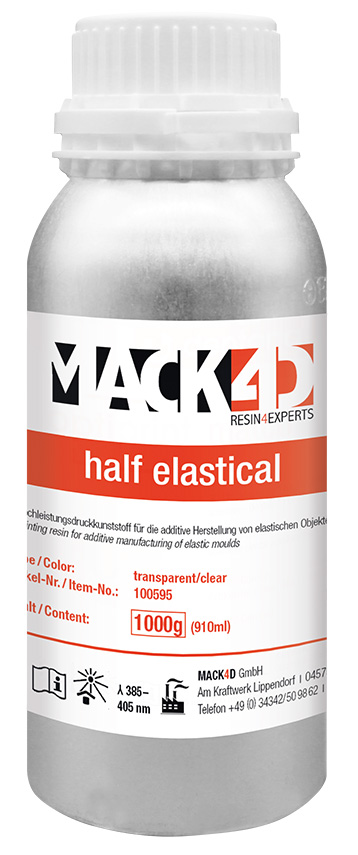 Mack4D half elastical ist ein elastisches Material um flexible Bauteile zu drucken. Mit einer Shore Härte von 55 A ist sehr weich, dabei aber reissfest. Es wird für alle Objekte eingesetzt bei dem eine flexible Oberfläche entscheident ist.