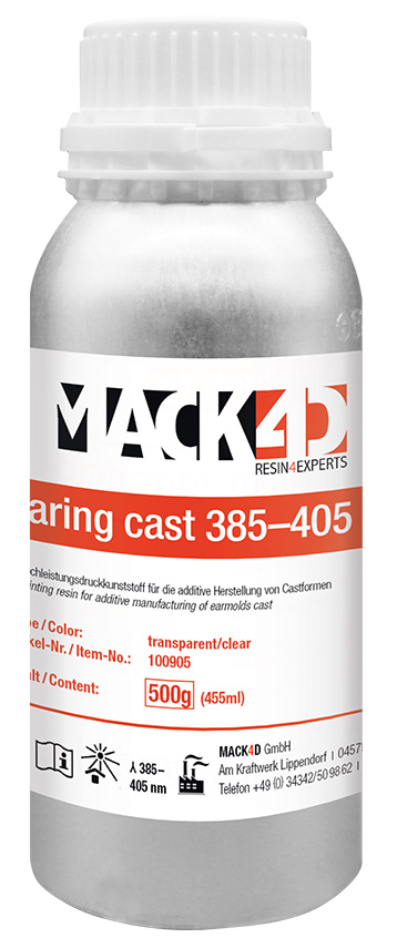 Our customers love MACK4D Hearing Cast  because it is transparent. The user can easily detect air bubbles in the silicone. In addition, it is easy and fast to "crack". The material can be processed with all standard DLP or LCD printers.